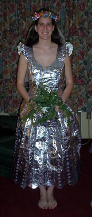 Julie models the bridal outfit. The plant came from our hotel room, and though it wasn't made of wrappers, it was at least fake. Photo by Sasha Kopf